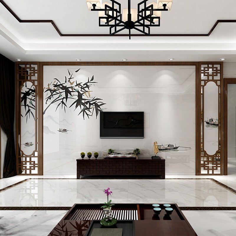 新中式电视背景墙瓷砖安装客厅微晶石影视墙装饰实木花格江南竹韵热门设计联盟服务商